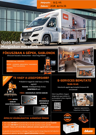 Emellett nagy örömünkre szolgál, hogy megrendezésre kerül a Blum szakmai nap (29.-én), amelyre szeretettel meghívjuk Önöket. Az esemény remek lehetőséget biztosít arra, hogy első kézből ismerjék meg a legújabb trendeket, megoldásokat, valamint szakértői tanácsokat kapjanak.